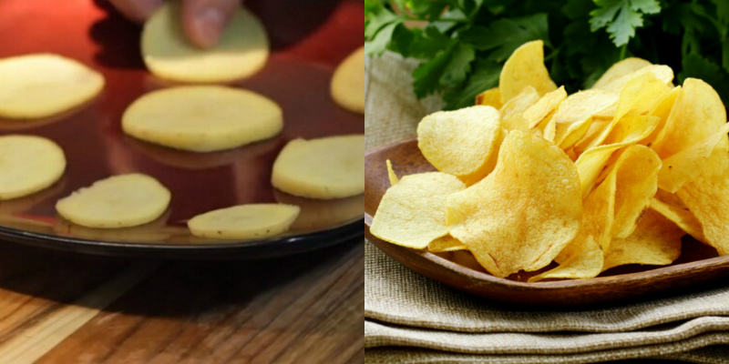 Na papierze do pieczenia, ułóż ziemniaki pokrojone w cieniutkie plasterki, skropione olejem. Do smaku, możesz je również posypać sola lub ulubionymi przyprawami. Podgrzewaj w mikrofali przez 3 minuty, a następnie przewróć je na drugą stronę i piecz w rozgrzanym piekarniku przez kolejne 3 minuty.