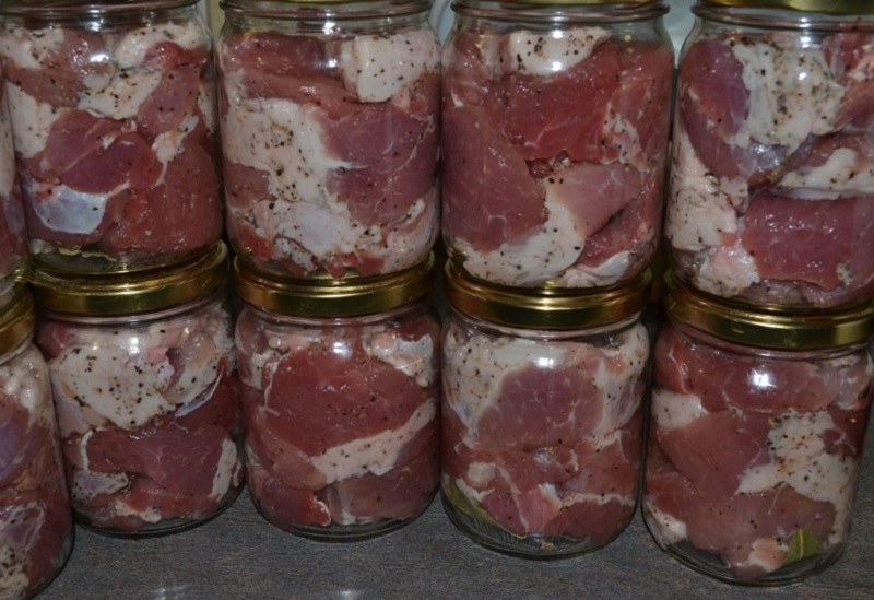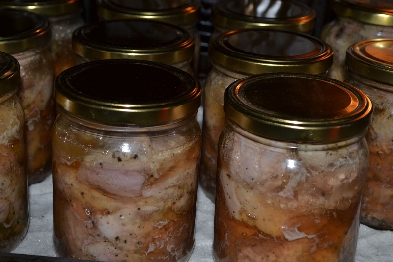 6.Mięso powinno sięgać poziomu poniżej 2-3 cm krawędzi słoika, tak aby nie wyciekała zawartość. Na blachę do pieczenia połóż słoiki i wlej odrobinę wody. Słoiki przykryj pokrywkami żelaznymi.