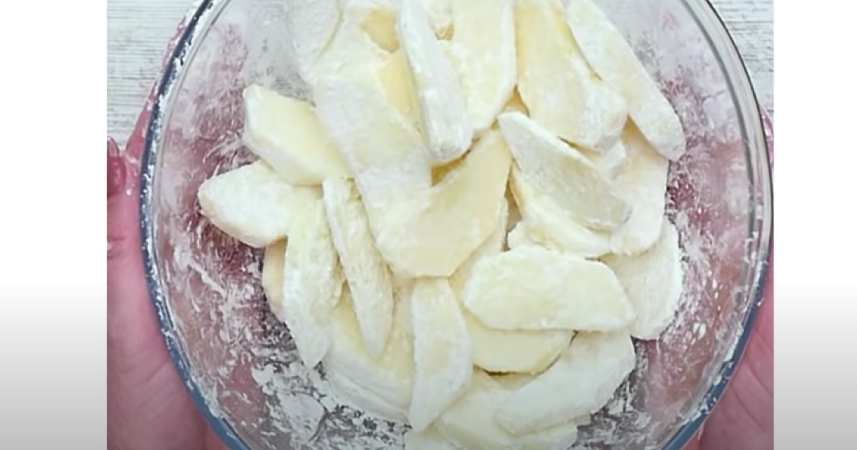5. Jabłka obierz, usuń gniazda nasienne i pokrój w cienkie plasterki. Posyp skrobią i dokładnie wymieszaj, aby była na całej ich powierzchni.