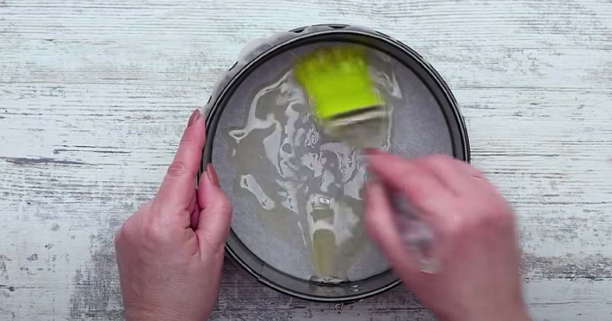 6. Połowę gotowego ciasta, wyłóż do okrągłej formy, przykrytej papierem do pieczenia i wysmarowanej olejem.