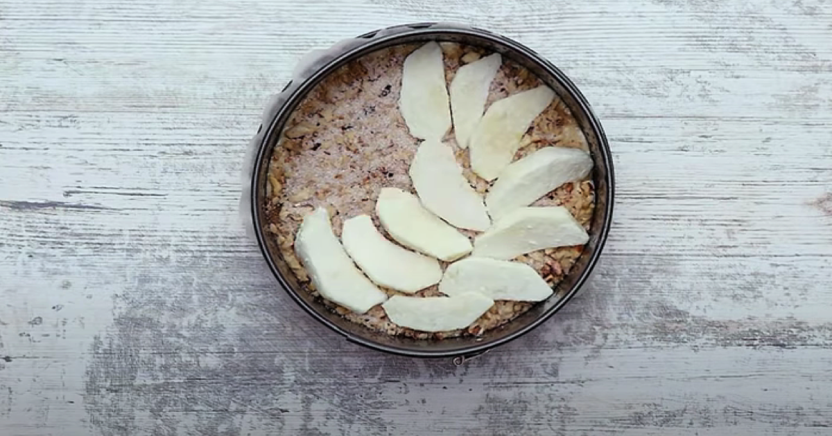 7. Następnie, ułóż warstwę prażonych orzechów i połowę jabłek, a na wierzchu odsączone z koniaku morele i rodzynki, zalej pozostałym ciastem i wygładź powierzchnię. Na wierzchu, poukładaj pozostałe jabłka i posyp pozostałymi orzechami.