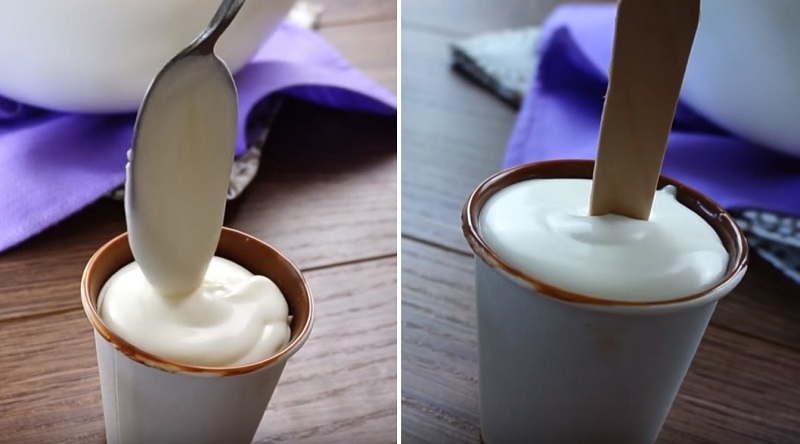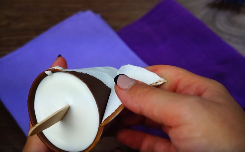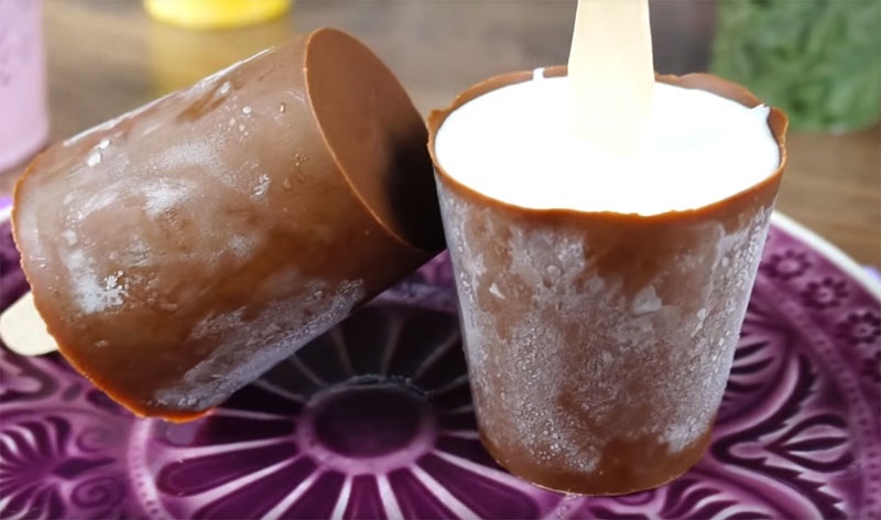 7. Po wyjęciu kubeczków z zastygniętą czekoladą wlej do każdego wcześniej przygotowaną masę lodową. Następnie włóż do każdego kubeczka po jednym patyczku. Lody powinny teraz mrozić się przez około 5 godzin lub nawet całą noc.