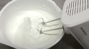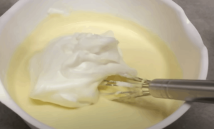 Do mieszanki dodać kolejno trzy części ubitego białka – najpierw jedną, po jej ubiciu delikatnie dołączyć kolejną, by nie stracić zawartego już w środku powietrza.