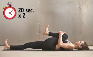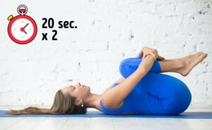 Kładziemy się na plecach ze zgiętymi nogami. Następnie owijamy ramionami kolana, przyciągając je w stronę klatki piersiowej. Im mocniej przyciągamy kolana, tym bardziej napina się dolna część ud i pleców. Pozostajemy w takim ułożeniu przez 20 sekund, powtarzając dwa razy. Dzięki temu ćwiczeniu pobudzamy do zwiększonego ruchu mięśnie zlokalizowane w dolnej części pleców, a także przyczyniamy się do lepszego przepływu krwi.