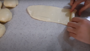 Dopiero teraz dodaj mąkę. Całość mieszaj przez około 5-7 minut. Następnie daj masie „odpocząć”. Po upływie 1,5 godziny rozsmaruj na blacie (lub drewnianej stolnicy) olej. Delikatnie przełóż na niego ciasto i podziel na 10 równych porcji. Uformuj z nich kulki, następnie lekko rozwałkuj i zwiń w 10 równych rolek.