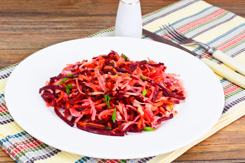 Obrane buraki, marchewkę oraz jabłko zetrzeć na tarce o średnich oczkach. Cebulę drobno pokroić. Kapustę poszatkować. Polej przygotowane warzywa olejem oraz octem, dodaj przyprawy i gotowe!