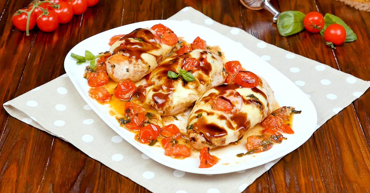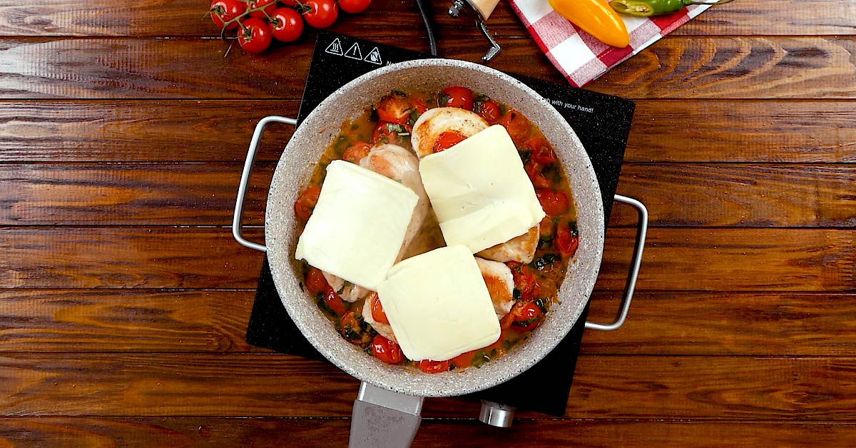 3. Pokrojoną bazylię dodaj na koniec dokładnie wymieszaj, na patelni ponownie ułóż fileta z kurczaka. Pomidory koktajlowe podsmażone układaj na wierzch mięsa oraz mozzarelli plasterek.