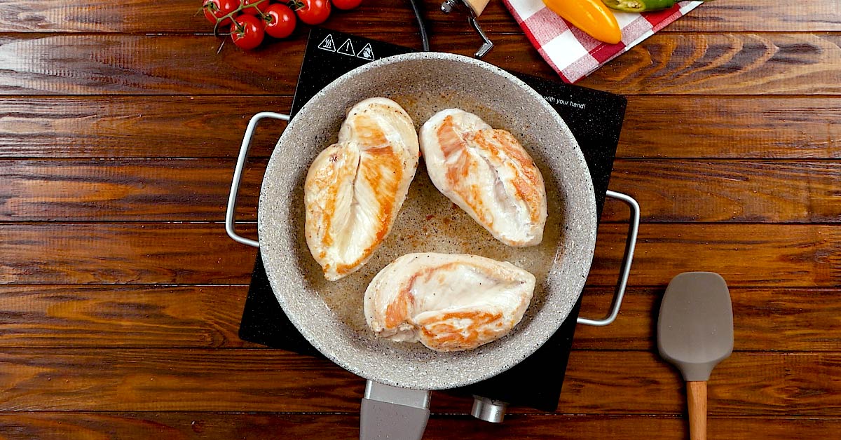 1. Na patelni z rozgrzanym olejem podsmaż fileta z kurczaka przyprawionego pieprzem oraz solą.