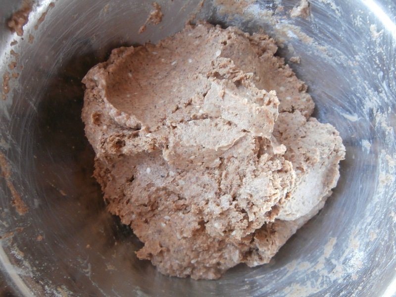 2. Teraz, dodaj przesianą mąkę żytnią, wymieszaj i zagnieć na jednolite ciasto. Powinno być nieco klejące, przełóż ciasto do formy wyłożonej papierem do pieczenia.