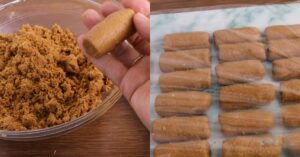 Ciasteczka zmiel na miazgę w blenderze. Jeżeli nie masz blendera, włóż je do papierowej torby i rozkrusz je uderzając o nie wałkiem do ciasta. Przesyp je do miski. Dodaj do nich masło orzechowe i dokładnie wymieszaj aż do uzyskania jednolitej masy bez grudek. Uformuj masę w podłużne wałeczki równej wielkości.