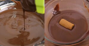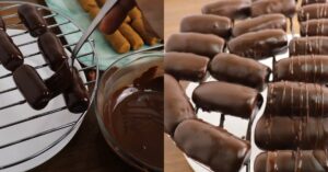 Fajnym pomysłem jest zrobienie na nich nieregularnych wzorków z białej czekolady. Wyglądają wtedy bardzo fantazyjnie. Gdy polewa wystygnie, smakołyki są gotowe do jedzenia. Aby przyśpieszyć proces zastygania polewy możesz włożyć batoniki do lodówki.