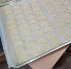 Po tym czasie rozwałkuj ciasto na blacie obsypanym mąką na grubość 30-40 mm. \wytnij ciasteczka przy pomocy foremek. Ułóż na blaszce do pieczenia. Piecz w rozgrzanym do 180 stopni piekarniku przez 8-10 minut.