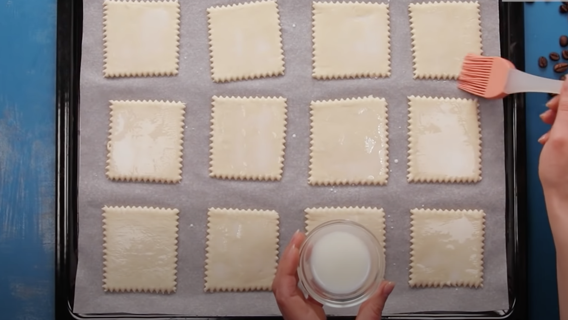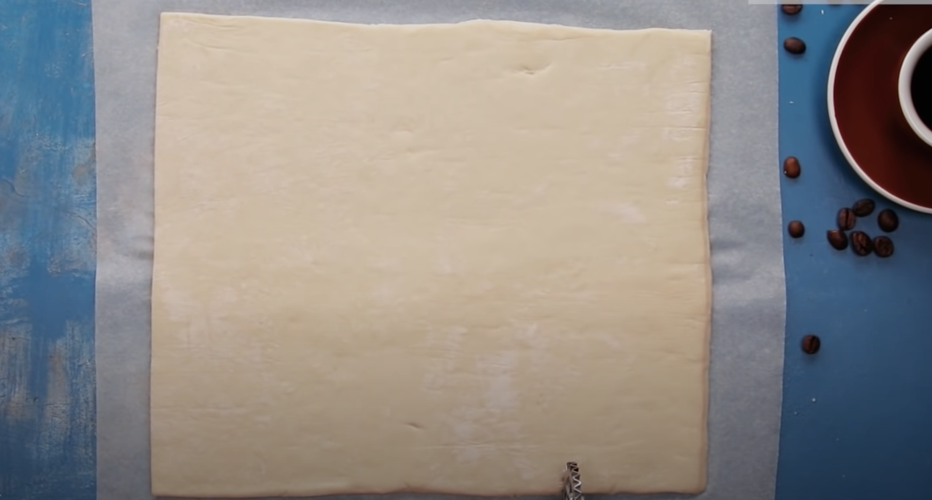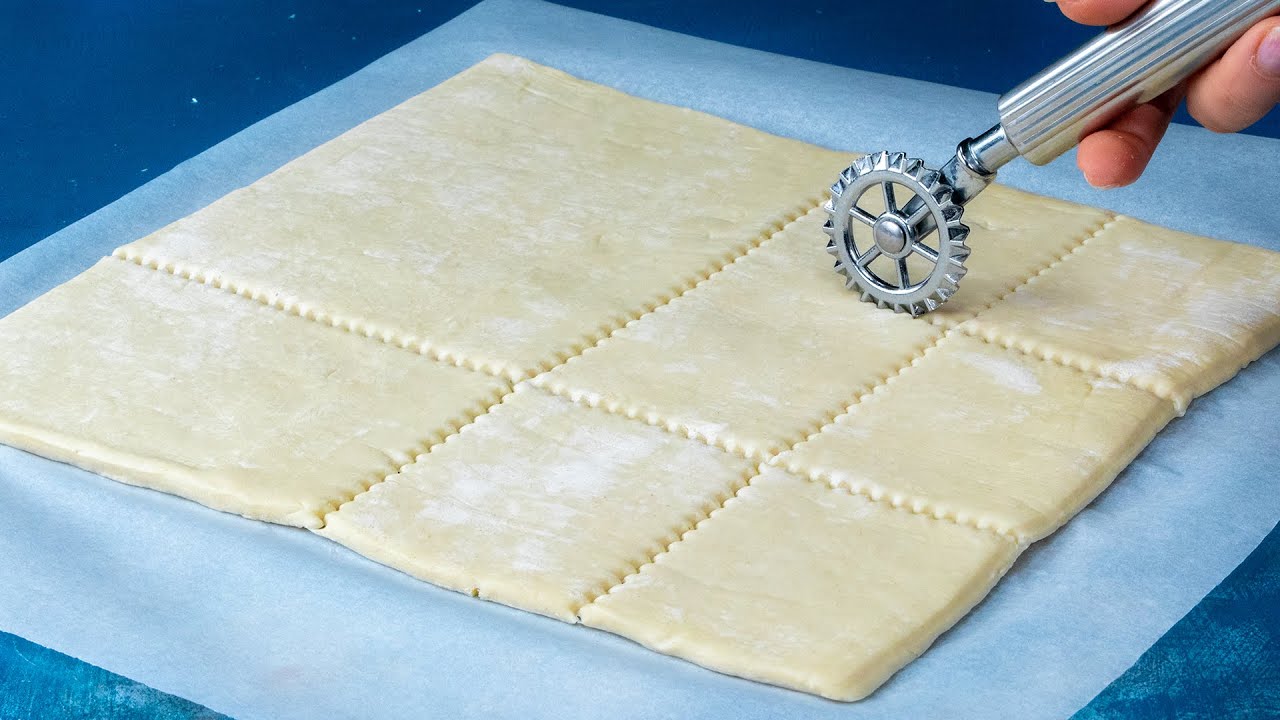 Arkusz ciasta francuskiego kroimy na równe kwadraty. Można to zrobić przy pomocy kółka do pierogów.
