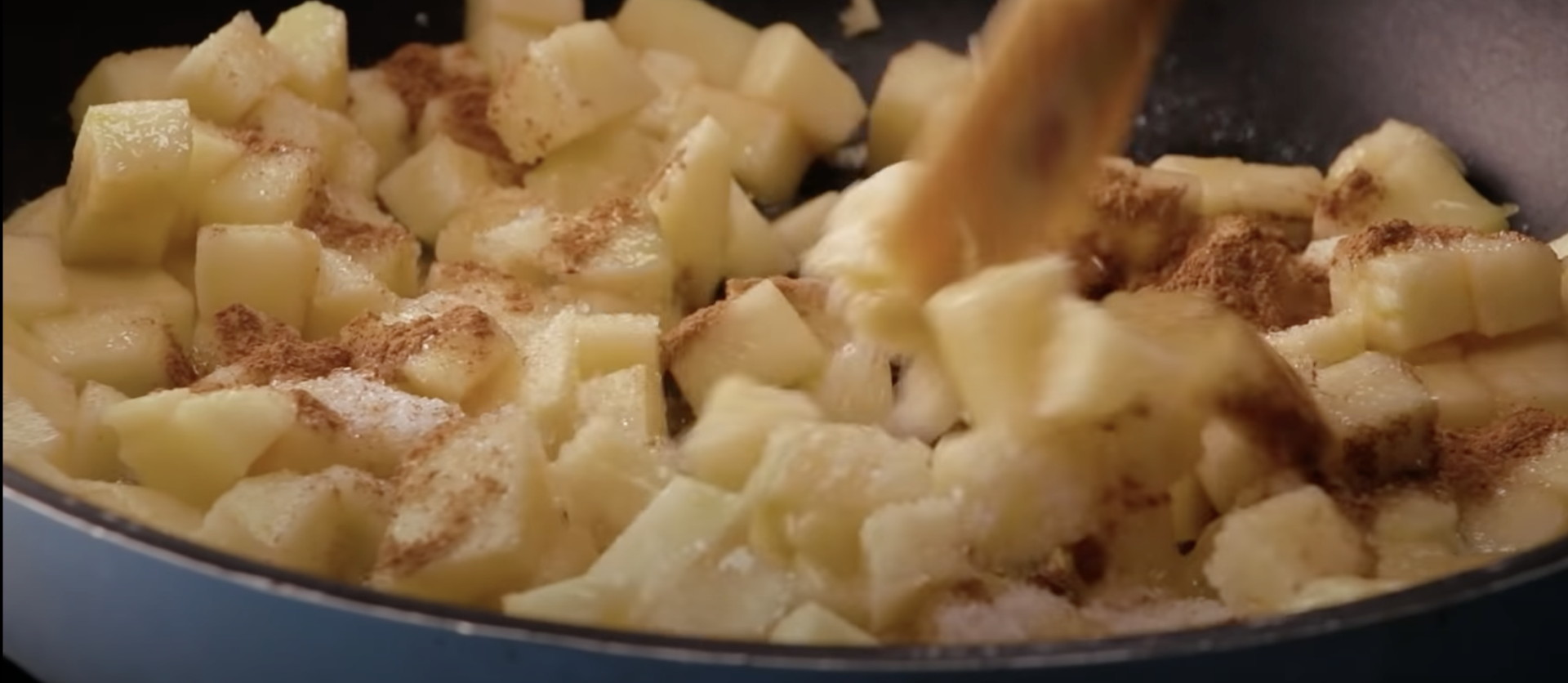 Pokrojone w kostkę jabłko wrzucamy na patelni i podsmażamy lekko na maśle. Dodajemy następnie cynamon i cukier.