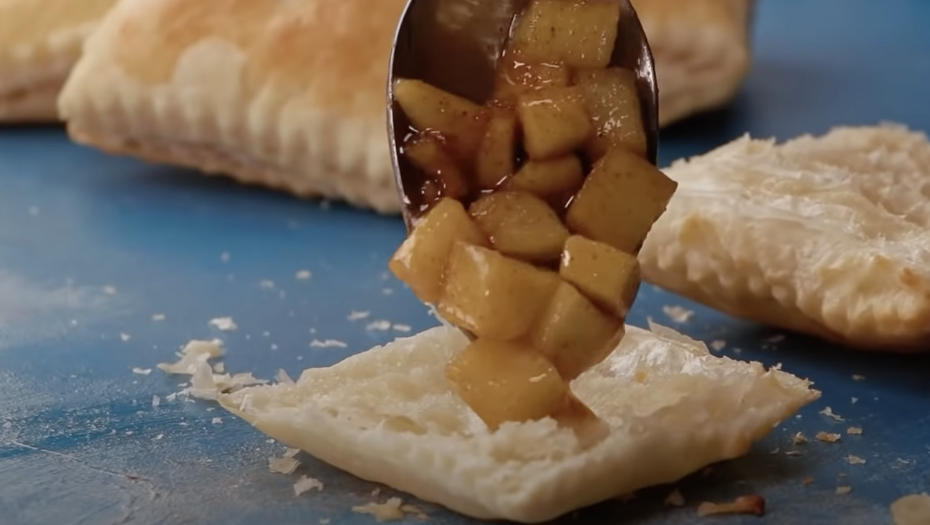 Następnym krokiem jest przekrojenie w poprzek upieczonych kwadratów z ciasta francuskiego. Przy pomocy rękawa cukierniczego nakładamy na jedną połówkę przygotowany krem, a drugą połówką wszystko przykrywamy. Dla urozmaicenia smaku można dodać również karmelizowane jabłko.