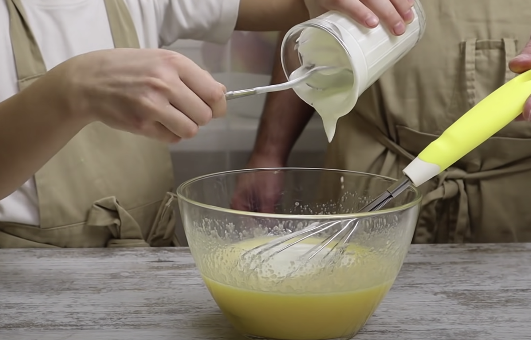 1. W wygodnej misce, ubij jajka z cukrem i cukrem waniliowym. Potem, dodaj jogurt naturalny i dokładnie wymieszaj.