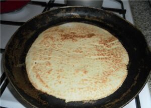 Odstawione wcześniej ciasto rozwałkuj na kształt przypominający kiełbaskę i podziej następnie na 14 kawałków. Każdy kawałek rozwałkuj tak, aby jego wielkość była zbliżona do wielkości twojej patelni. Każdy kawałek ciasta piecz osobno na suchej, rozgrzanej patelni, używając do tego średniego ognia (ciasto piecze się bardzo szybko, dlatego uważaj, aby się nie przypaliło).
