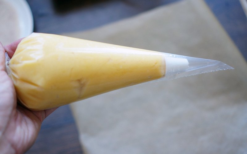 Do ciepłego ciasta dodaj jajka, ciągle mieszając, aż wszystkie składniki dobrze się połączą. Przygotuj rękaw kuchenny, który będzie trzymał ciasto podczas wyrabiania. Pamiętaj o przycięciu końcówki rękawa kuchennego.