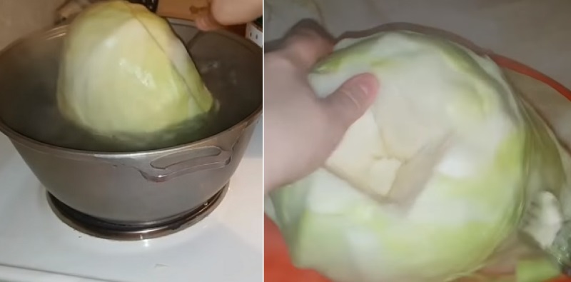 Pierwszym etapem jest odpowiednie przygotowanie liści kapusty. Robimy to tak, jak w przypadku zwykłych gołąbków – do gotującej się wody wrzucamy główkę kapusty, a następnie oddzielamy od niej liście tak, by ich nie zniszczyć.