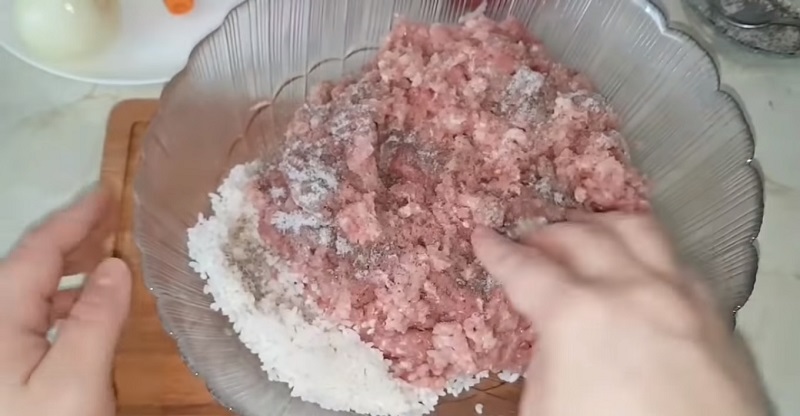 Gdy ryż już napęcznieje, dodajemy do niego zmielone mięso wieprzowe. Do naszego nadzienia dodajemy szczyptę soli oraz pieprzu, a całość dokładnie mieszamy i odstawiamy na kilka minut.