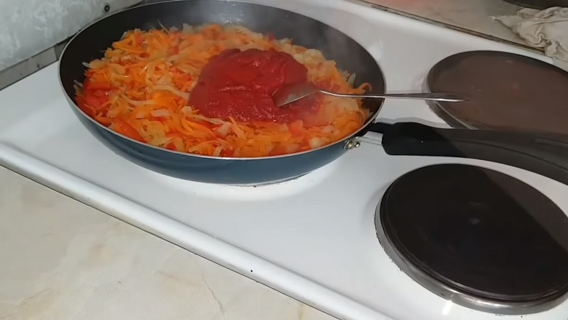 Do smażących się na patelni warzyw dodajemy trzy łyżki koncentratu pomidorowego i wszystko dokładnie mieszamy. Całość smażymy jeszcze jakieś dwie minuty, cały czas mieszając nasze warzywa.
