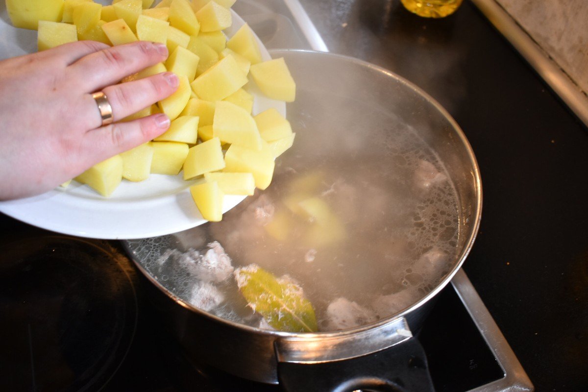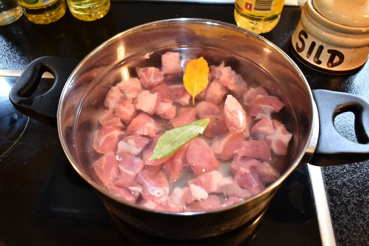 1.Mięso dokładnie umyj, osusz je ręcznikiem papierowym, następnie pokrój średniej wielkości kostkę. Wlej wodę do dużego garnka (4l), wrzuć mięso z dodatkiem liści laurowych i gotuj przez 20 minut.