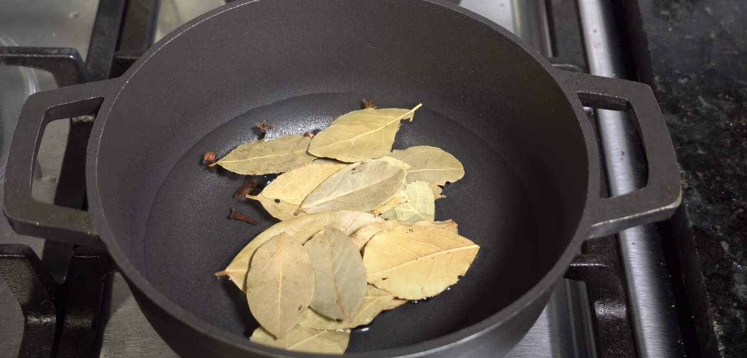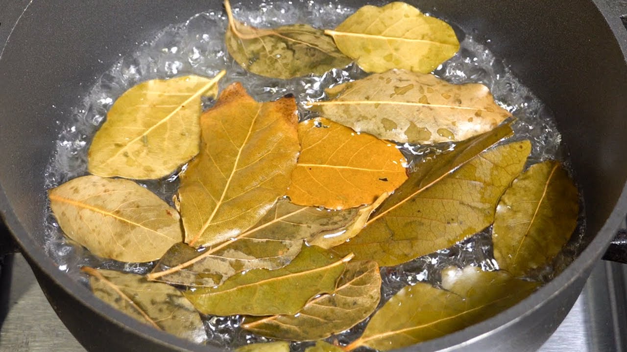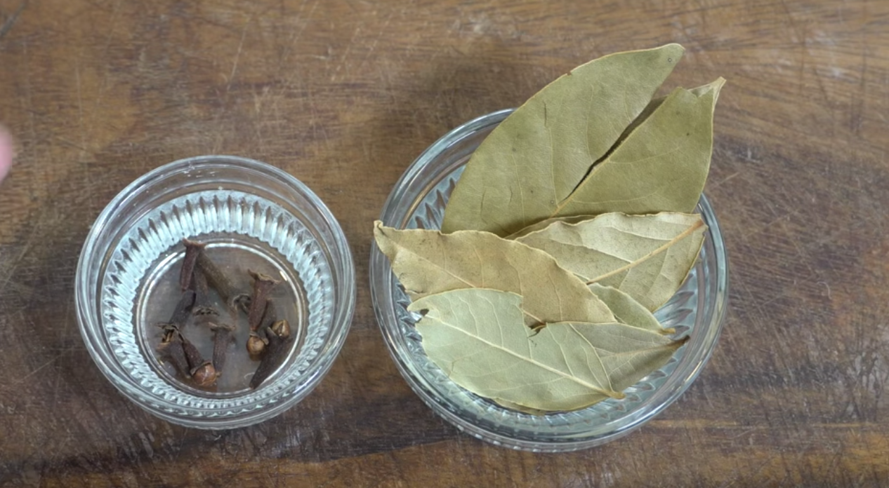 Wlej do garnka szklankę wody, zagotuj ją i dodaj powyższe składniki: 15 liści laurowych, 10 goździków.