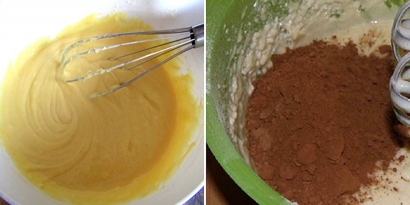 W pierwszej kolejności dodajemy proszek do pieczenia, szklankę cukru, 100 g rozpuszczonego masła, jedno opakowanie cukru waniliowego, wszystkie składniki mieszamy razem mikserem do uzyskania jednolitej konsystencji, następnie dodajemy jedna łyżkę kakao i ponownie wszystko razem mieszamy.