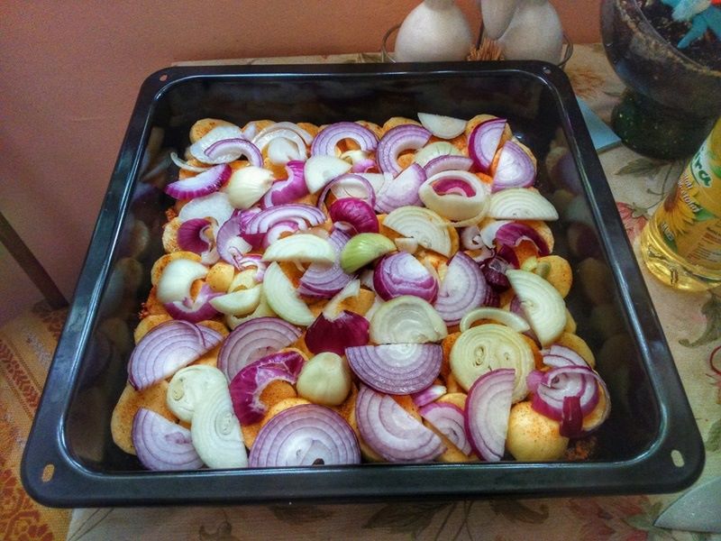 Na wierzchu ziemniaków ułóż boczek i cebulę w plasterkach.