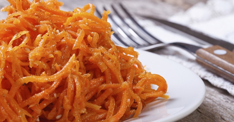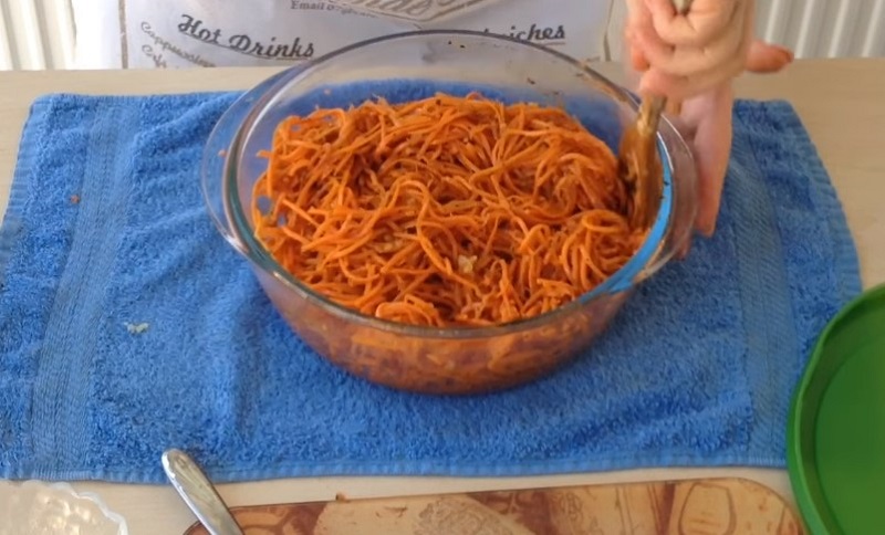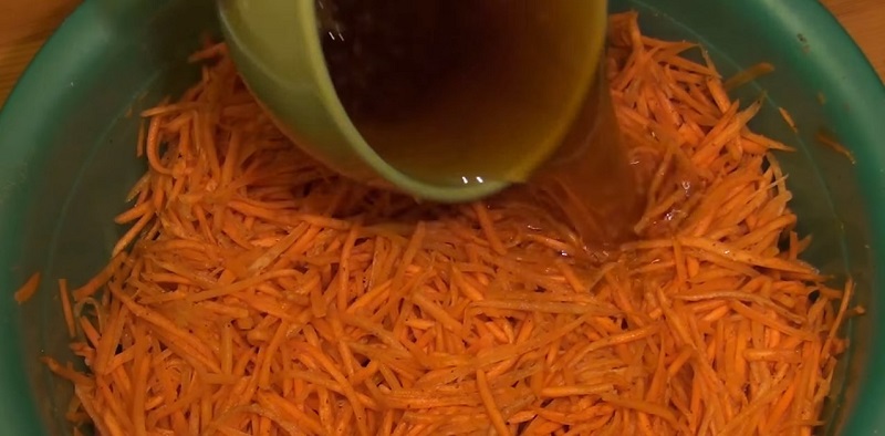 Na patelni podgrzewamy olej roślinny, ale nie doprowadzamy do wrzenia. Polewamy nim sałatkę i wszystko dokładnie mieszamy.