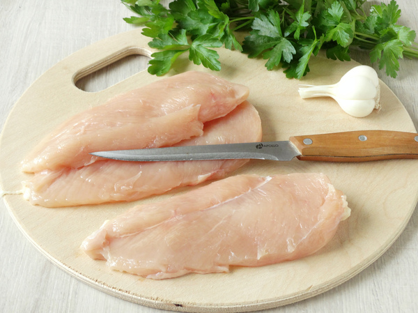 Umyj mięso i osusz je za pomocą papierowego ręcznika. Następnie pokrój kurczaka na cienkie kotleciki.