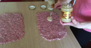 Następnego dnia mięso dzielimy na dwie części i formujemy z nich płaskie prostokąty. Przestępujemy do smarowania ich musztardą (lub keczupem).