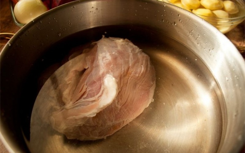 1. Na samym początku dokładnie umyj wieprzowinę, po czym włóż ją do garnka i zalej wodą. Gdy pojawi się szumowina , koniecznie ją zdejmij i zmniejsz gaz, następnie dodaj 1 cebulę oraz 1 marchewkę.