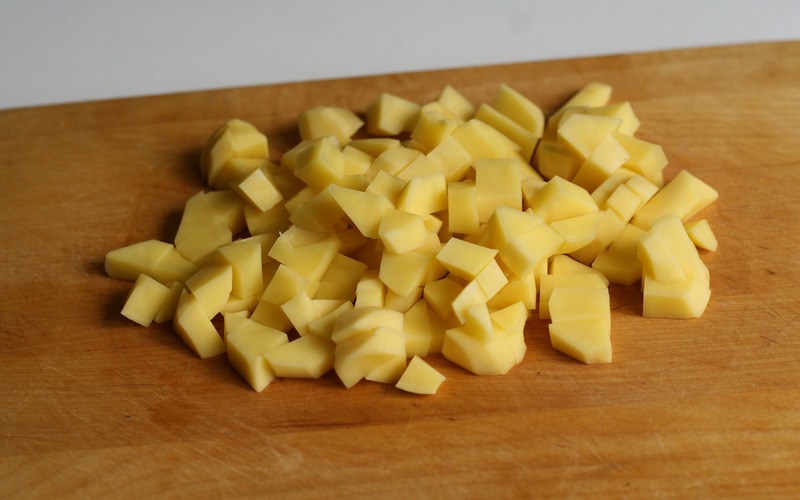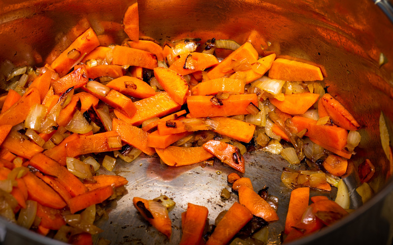 3. Wszystkie pozostałe obrane warzywa, pokrój na mniejszą kosteczkę, po czym włóż je na patelnie z rozgrzanym masłem albo smalcem, całość smaż przez kilka minut.