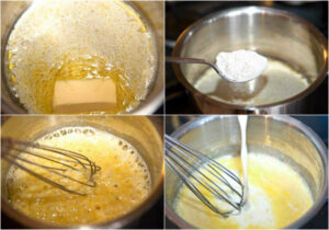 Obierz ziemniaki i ugotuj w całość na półtwardo w lekko osolonej wodzie. Gdy ziemniaki się gotują, przygotuj sos beszamelowy. Aby to zrobić, rozpuść masło w rondlu, dodaj do niego mąkę i dobrze wymieszaj, wciąż trzymając garnek na ogniu. Kiedy utworzy się biała piana na powierzchni, wlej zimne mleko i posól, kontynuuj mieszanie. Doprowadź sos do wrzenia i natychmiast zdejmij z ognia.