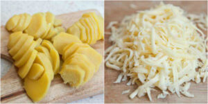 Pokrój mięso na kawałki. Cebulę pokrój w pierścienie, ziemniaki – w plastry. Ser zetrzyj na tarce.