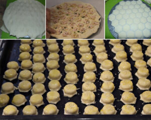 Podczas rośnięcia ciasta należy przygotować farsz. Kiełbasę oraz ser trzeba zetrzeć na grubej tarce, a do tej mieszanki konieczne jest dodanie czosnku i ziół. Do kolejnego etapu potrzebna będzie foremka na lody lub forma do ciasta z małymi oczkami, podobna wyglądem do plastra miodu. Ciasto należy podzielić na cztery części i każdą z nich rozwałkować na grubość od 2 do 2,5 mm.