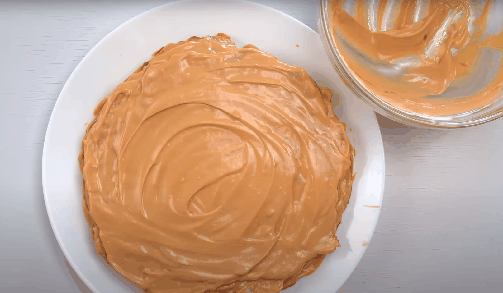 Ułóż jeden placek na drugim z mieszanką. Krem należy rozprowadzić na wierzchu ciasta. Następnie wstaw deser do lodówki na co najmniej kilka godzin. Ciasto można udekorować według własnego gustu, np. polewą czekoladową