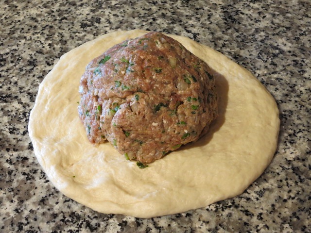Przygotuj sobie blat, nasmaruj go odrobiną oleju i połóż na nim ciasto. W międzyczasie zajmuj się przygotowaniem farszu do naszych placuszków. Obierz cebulę i posiekaj ją razem z czosnkiem, a następnie dodaj do głębokiej miski z mielonym mięsem.