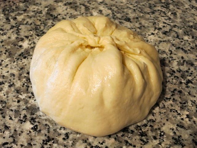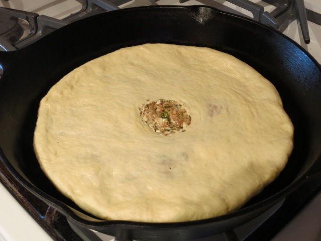 Złap krawędzie ciasta i połącz je nad nadzieniem, tworząc tak jakby taki worek. Ciasto u góry połącz dobrze ze sobą, by się nie rozleciało.