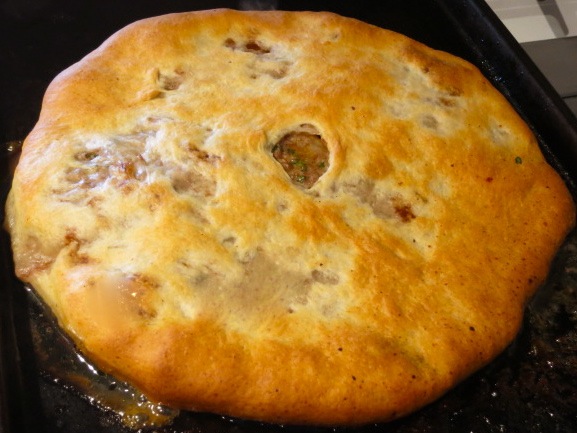Naczynie do pieczenia nasmaruj olejem, a następnie umieść w nim placek odwrócony go góry nogami. Staraj się go rozpłaszczyć ręką tak, by jego grubość miała około 1 centymetra. Na środku ciasta zrób niewielką dziurę.