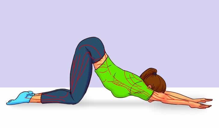 Uklęknij na podłodze, wyciągnij ciało. Pochyl górną część ciała tak, aby ręce dotknęły podłogi. Kolana muszą być ugięte pod kątem 90 stopni. Opuść powoli głowę, oprzyj podbródek o ziemię i rozluźnij mięśnie szyi. Łokcie nie mogą dotykać podłogi. W tej pozycji wytrzymujesz 30-60 minut.