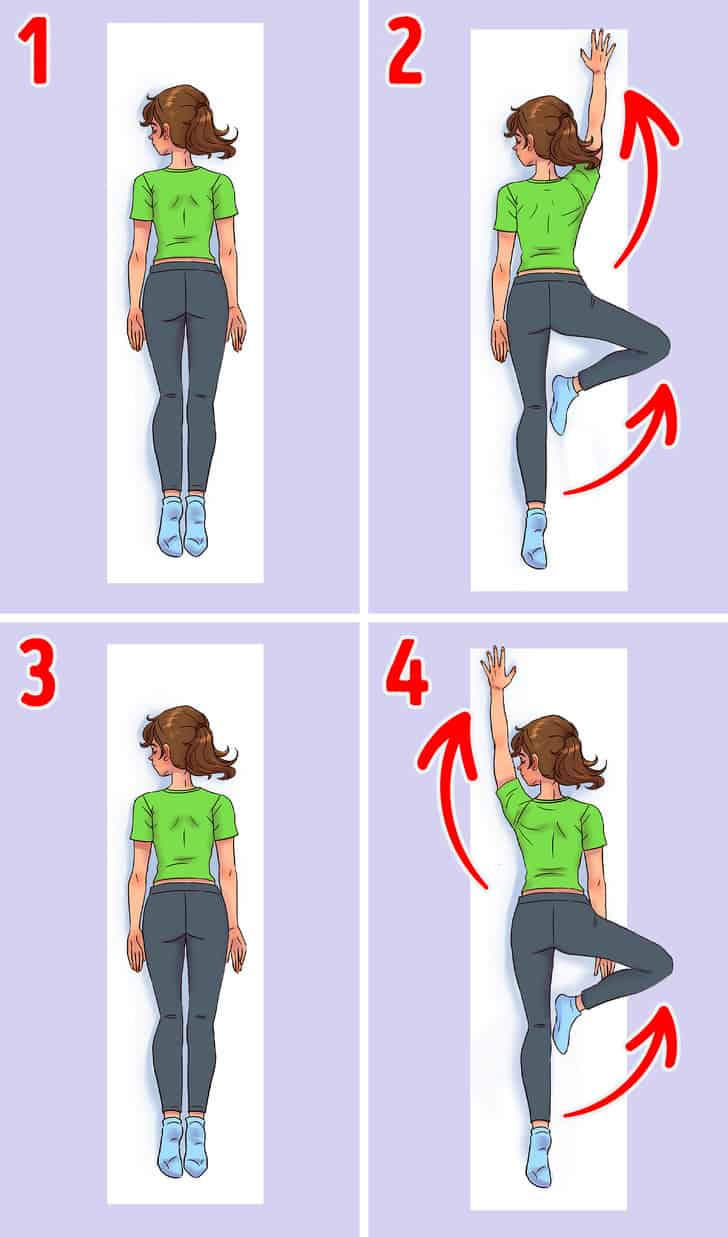 Kładziesz się na brzuchu. Ręce wzdłuż ciała, nogi wyprostowane i złączone razem. Lewą nogę i rękę utrzymuj w stałej pozycji. Prawą rękę przesuń nad głowę i odchyl prawe kolano możliwie najwyżej. Prawa ręka i noga wracają do pierwotnej pozycji. Wykonaj te same ruchy na lewą stronę. Powtarzaj ćwiczenie 30-60 sekund.