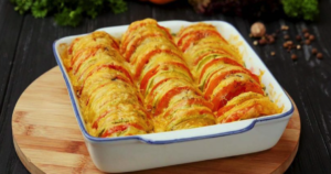 Cebulę obierz i pokrój w drobną kostkę. Następnie podsmaż ją na rozgrzanym oleju, aż się zeszkli. Przełóż do naczynia żaroodpornego. Ziemniaka obierz, pokrój w plastry, podobnie zrób z cukinią (jeśli jest młoda to nie musisz jej obierać) oraz pomidorami. Warzywa ułóż naprzemiennie w naczyniu żaroodpornym.