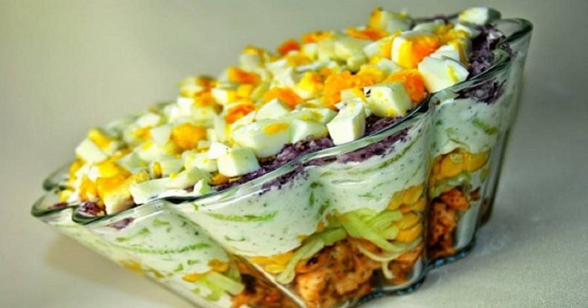 4. W szklanej misce układaj wszystkie składniki warstwami, zacznij od kurczaka, następnie por, kukurydza przygotowany sos Tzatziki, pokrojona cebula oraz jajka. Tak przygotowana sałatka jest gotowa!