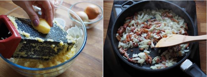 1. Na samym początku zetrzyj na małych oczkach obrane oraz umyte surowe ziemniaki.