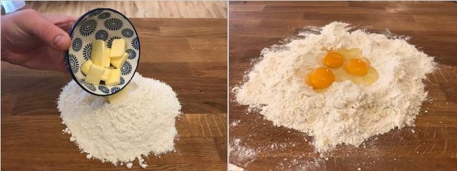 5. W między czasie zacznij przygotowywać ciasto. Do dużej miski wbij 2 jajka oraz żółtko, następnie wsyp mąkę, sól oraz dodaj masło. Całość dokładnie wymieszaj, następnie stopniowo wlewaj wodę i zagniataj rękoma ciasto. Gotowe ciasto przykryj na około 15 minut czystą ściereczką.