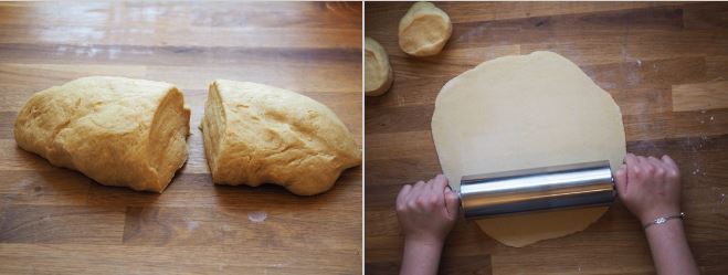 6. Po tym czasie dokładnie rozwałkuj ciasto na blacie posypanym mąką. W przypadku gdy ciasto się przykleja koniecznie posyp je mąką.