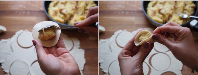 7. Najlepiej szklanką zacznij wycinać kółka. Następnie na każdy krążek kładź łyżeczka nie wielką ilość farszu, po czym sklejaj tak jak zawsze.