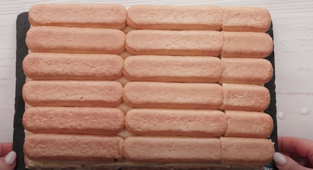 5. Na wyłożone biszkopty połóż połowę budyniu, następnie krem z orzechami i na to drugą część budyniu , całość przykryj resztą biszkoptów.